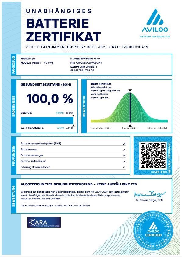 Akustischer Fußgängerschutz (Außensound), Außenspiegel elektr. verstell- und heizbar, elektr. anklappbar, Bluetooth Audio-Streaming, DAB-Tuner (Radioempfang digital), Dachhimmel Grau, Dachspoiler, Elektrofahrzeug, Elektromotor 100 kW (cont. 57 kW), Elektron. Stabilitäts-Programm Plus (ESP), Fahrassistenz-System: Fernlichtassistent, Fahrassistenz-System: Müdigkeitserkennungs-Sensor, Fahrassistenz-System: Verkehrszeichenerkennung, Fahrzeugschlüssel (2) beide klappbar, Feststellbremse elektrisch, Freisprecheinrichtung Bluetooth, Heckleuchten LED, Karosserie: 5-türig, Keyless Start, Klimaautomatik, Kopf-Airbag-System, Kühlergrill, Opel Vizor, Rahmen in Chrom, Ladekabel mit Schukostecker (Mode 2), Ladevorrichtung On-Board-Lader (11 kW), LM-Felgen, MP3-Schnittstelle für Mobiltelefon/Handy, Opel Connect, Parkpilotsystem hinten, Radstand 2561 mm, Reifen-Reparaturkit, Scheinwerfer LED, Seitenairbag vorn, Sicht-Paket, Wärmepumpe zur Reichweitenoptimierung, Wärmeschutzverglasung